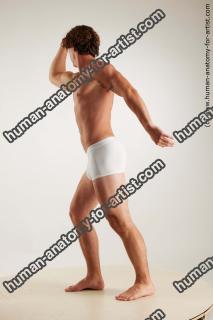 Male model poses dramatically in studio setting highlighting physique and tattoos with soft lighting A male model stands in a confident pose on a platform, showcasing his physique and tattoos. The soft lighting emphasizes his muscular structure in a studio environment.